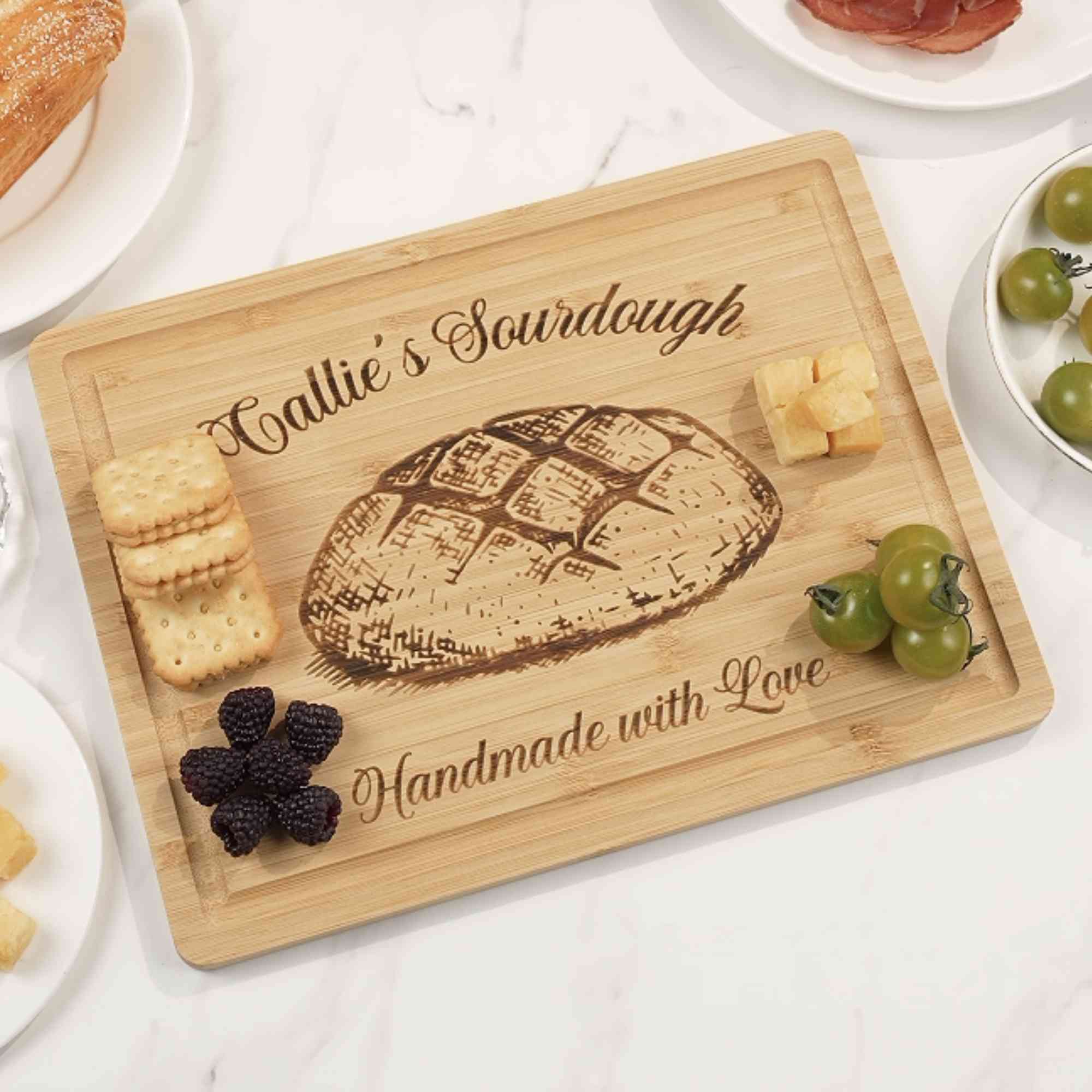 Personalisiertes Sauerteig-Schneidebrett mit Namen, individuell graviertes Bambus-Schneidebrett für Wurstwaren, Küchenaccessoire, Einzugsgeschenk für Bäcker/Gastgeberinnen